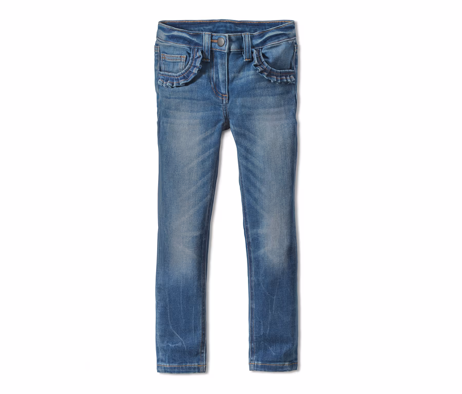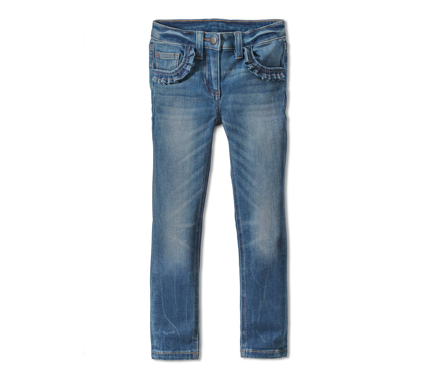 Diese Skinny-Jeans ist im zeitlosen 5-Pocket-Style gefertigt und bekommt durch die Rüschendetails an den vorderen Taschen im Zusammenspiel mit ihrem modischen Used-Look einen ganz eigenen Charakter. Ihr hoher Baumwollanteil macht die Kinderhose besonders hautsympathisch, Elasthan und der innenliegende Verstellriegel im Bund sorgen gleichzeitig für Formbeständigkeit, einen perfekten Sitz und zusätzlichen Tragekomfort. Die Hosen in den Größen 110/116 und 122/128 werden mit einem Druckknopf geschlossen, in den Größen 134/140 bis 170/176 haben sie einen klassischen Knopf.