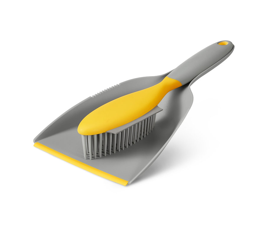 Die Gummiborsten am Handkehrer und die Abstreifkante an der Kehrschaufel machen das Putzen besonders bequem. Zusätzlich ist der Handfeger mit einem ergonomisch geformten Soft-Touch-Griff und einer Gummilippe zum Abziehen von nassen Flächen ausgestattet. Das Putz-Set ist mit einem recycelten Kunststoffanteil hergestellt, kann an einer Aufhängeöse ordentlich verstaut werden und lässt sich einfach unter fließendem Wasser reinigen.
