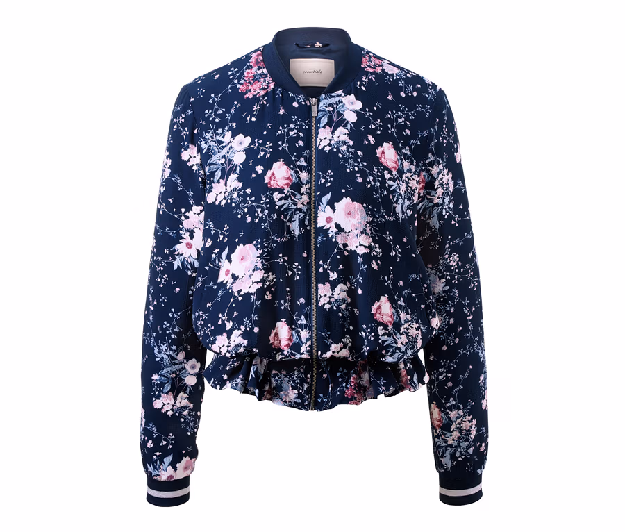 Die gefütterte Fliegerjacke hat zwei Eingrifftaschen und ist am Ausschnitt sowie an den Ärmeln mit Komfortbünden versehen. Auf ihnen setzen silberfarbene Kontraststreifen dekorative Akzente und ergänzen perfekt den floralen Alloverprint. Mit einem Tunnelzug im femininen Volantsaum kann die Jacke in der Weite angepasst werden.