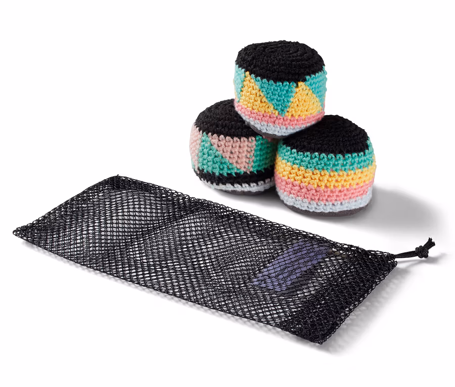 Bisschen kicken? Mit diesen drei Footbags kann man im Park zeigen, was man kann – oder es zumindest versuchen. Der Klassiker ist natürlich, den Ball möglichst lange ohne Hilfe der Hände in der Luft zu halten, aber auch für das Gegenteil lassen sich die Bälle nutzen: Dank ihrer kompakten Form und dem guten Griff eignen sie sich hervorragend zum Jonglieren. In jedem Fall trainiert man damit Beweglichkeit, Koordination und Reaktionsvermögen und mit der Aufbewahrungstasche kann man sie bei jedem Ausflug immer dabeihaben.