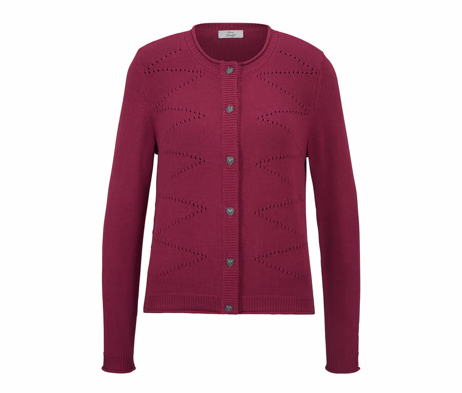 Der traditionelle Trachten-Look der Jacke wird durch sechs Metallknöpfe in Herzform mit dekorativer Prägung und einem strukturierten Ajour-Lochmuster auf der Vorderseite unterstrichen. Die aus weicher Baumwoll-Mischqualität gefertigte Jacke ist zudem an Halsausschnitt, Ärmeln und Saum mit einem schmalen Rippbündchen ausgestattet. Durch den Anteil an Bio-Baumwolle liegt die Jacke angenehm auf der Haut.