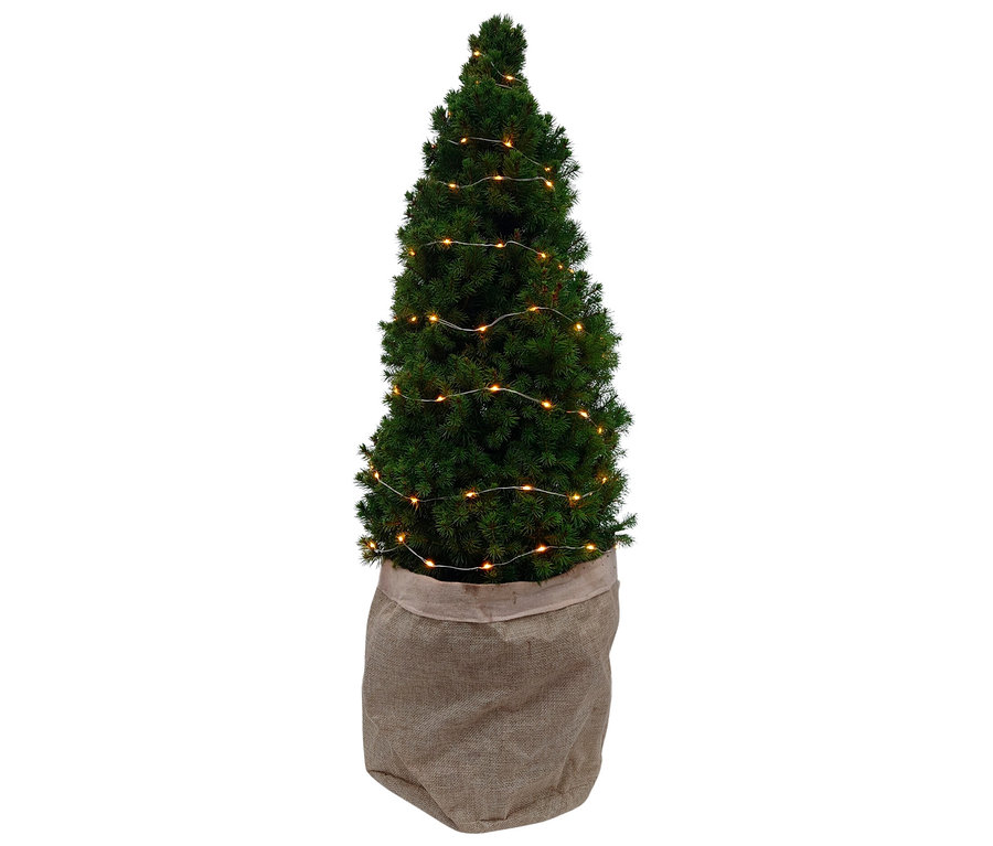 - Immergrüne und winterharte Zuckerhutfichte mit Jutesack und Lichterkette
