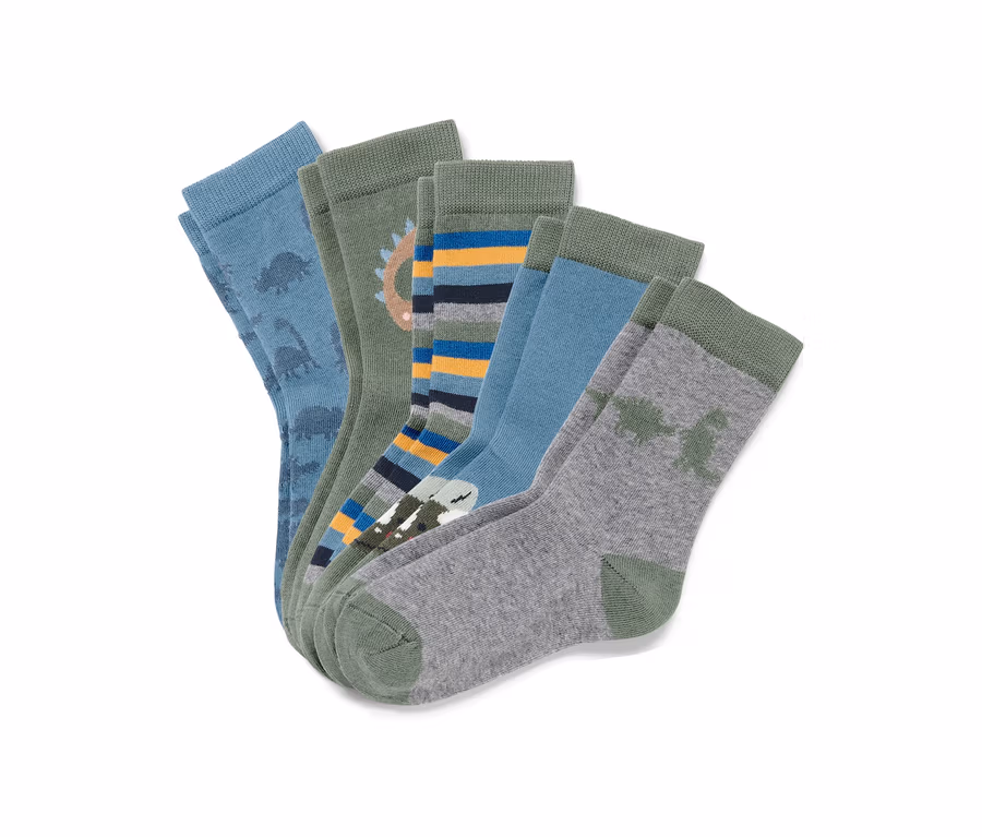 - 1x mittelblau mit Dino-Allovereinstrick, 1x tannnengrün mit braunem Dino-Einstrick, 1x mehrfarbig geringelt, 1x mittelblau mit tannengrünem Dino-Einstrick, 1x grau meliert mit tannengrünem Dino-Einstrick