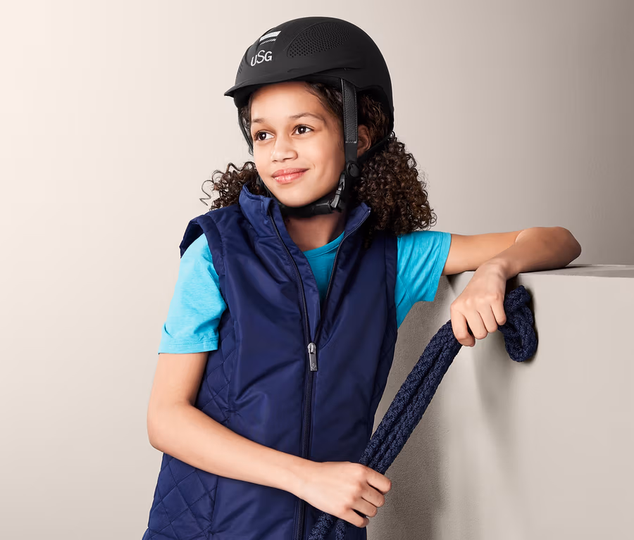 Der Kinderhelm hat eine stoßabsorbierende Innenschale aus Polystyrolschaum und das softe Innenfutter lässt sich herausnehmen. Die Perforierung in der Außenhülle sorgt auch bei längeren Reiteinheiten für eine gute Luftzirkulation und durch die soft unterlegte 4-Punkt-Begurtung sowie das angenehm weiche Nackenschutzpad hat er auch jederzeit eine perfekte Passform und einen optimalen Sitz. Mit dem Einstellrad auf der Rückseite lässt sich der Helm in der Größe verstellen – und das matte Schwarz verleiht ihm seinen eleganten Look. Erhältlich ist er in zwei Kindergrößen: XS–S für einen Kopfumfang von etwa 48 bis 52 Zentimetern und Größe S–M für circa 52 bis 56 cm Kopfumfang.