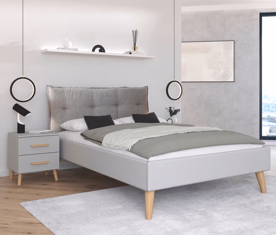 - Modernes Bett mit bequem gepolstertem Bettkopfteil in Hellgrau