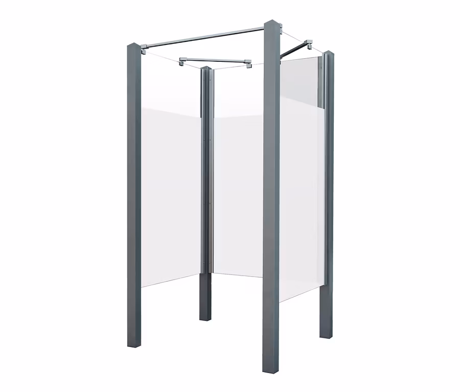 - Inkl. 4 Pfosten mit Abdeckkappen, 3 Glaselementen, 2 45°-Stabilisatoren, 1 90°-Stabilisator, Montageanleitung und Garantiekarte