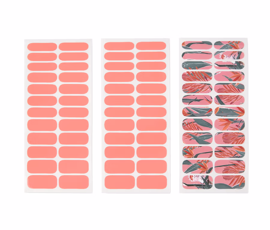 2 Folien à 24x aprikosenrosa, 1 Folie à 24x mehrfarbiges, tropisches Muster
