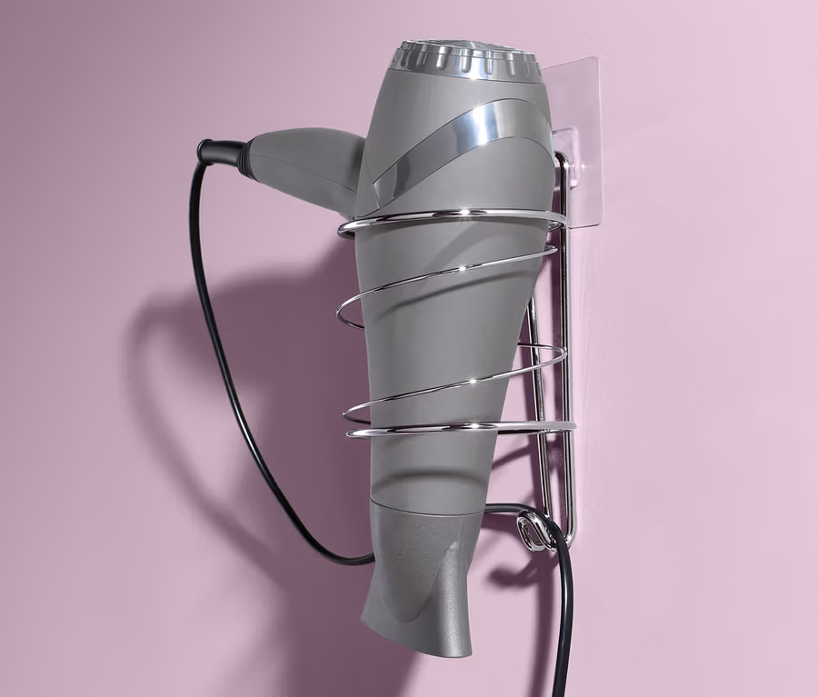 Manchmal merkt man nach dem ersten Montieren, dass die gewählte Position nicht optimal gelungen ist oder die Halterung einfach ein wenig schief hängt – das ist mit diesem System halb so wild. Die Klebefläche ist wiederverwendbar, kann somit mehrfach abgenommen und neu platziert werden, bis der perfekte Platz für den Föhn gefunden ist.