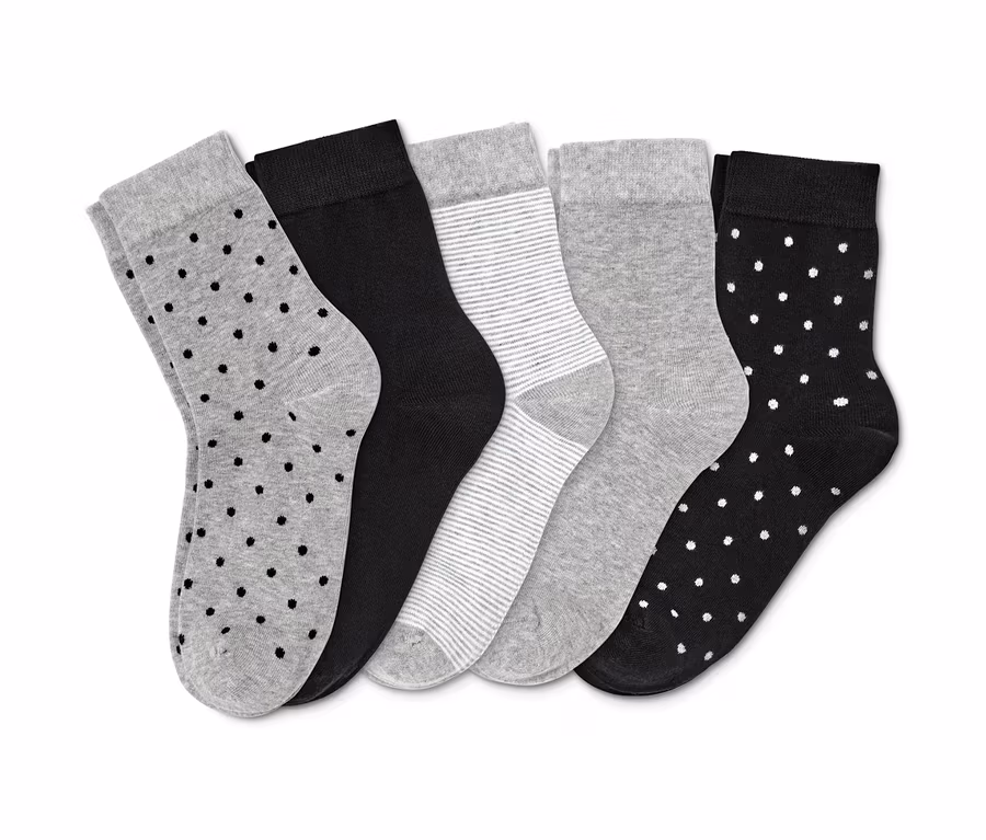 - 1x grau meliert mit schwarzen Punkten, 1x schwarz, 1x grau-weiß gestreift, 1x grau meliert, 1x schwarz mit grauen Punkten