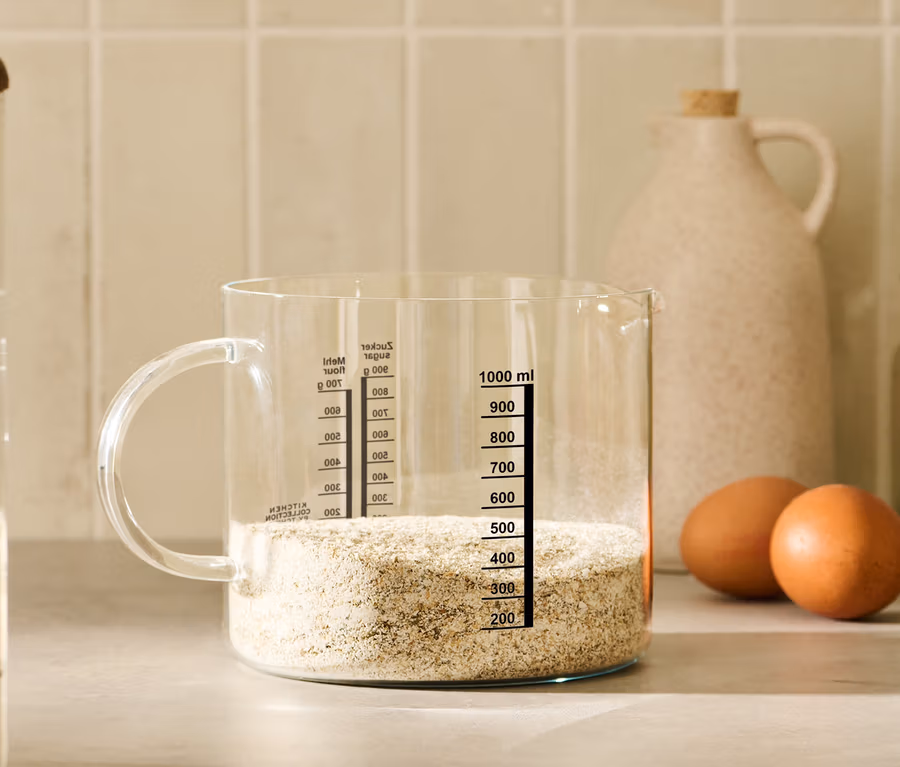 - Mit Skalierung für Flüssigkeiten in ml, für Zucker und Mehl in g