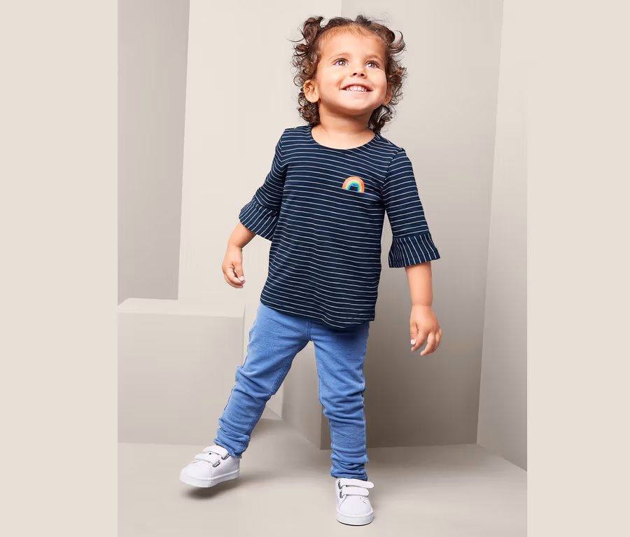 Mit diesem Shirt bekommt das Outfit einen echt damenhaften Look! Das Besondere an dem Kindershirt sind nämlich sein leicht ausgestellter Style und vor allem die ausgefallenen Trompetenärmel. Der kleine Regenbogen auf der Brust setzt dabei einen zusätzlichen hübschen Akzent. Das Oberteil ist aus reiner, GOTS zertifizierter Baumwolle gefertigt und liegt damit angenehm weich auf der Haut.