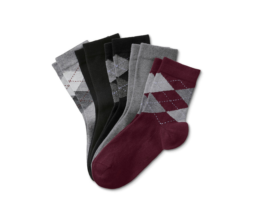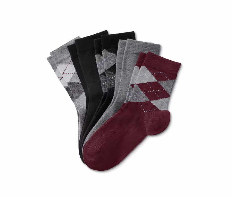 - 1x dunkelrot mit grauem Rautenmuster, 1x dunkelgrau meliert, 1x schwarz mit grauem Rautenmuster, 1x schwarz, 1x hellgrau meliert mit grauem Rautenmuster