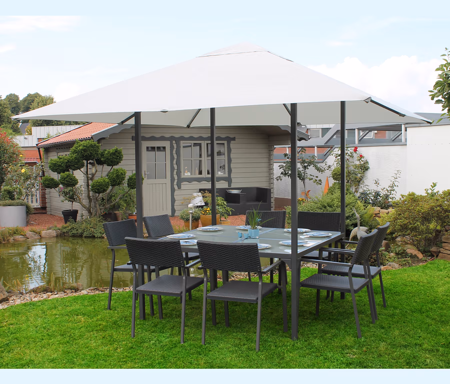So wird der Pavillon bei Sommerwetter zu einem wunderbaren Ort für gesellige Momente mit der Familie oder mit Freunden. Ob an der Kaffeetafel oder beim Galadinner – hier sitzt man gerne zusammen und kann das Leben genießen. Der UV- und witterungsbeständige Pavillon hat einen stabilen Stahlrahmen und das wasserabweisende Dach kommt auch mit einem leichten Schauer zurecht.