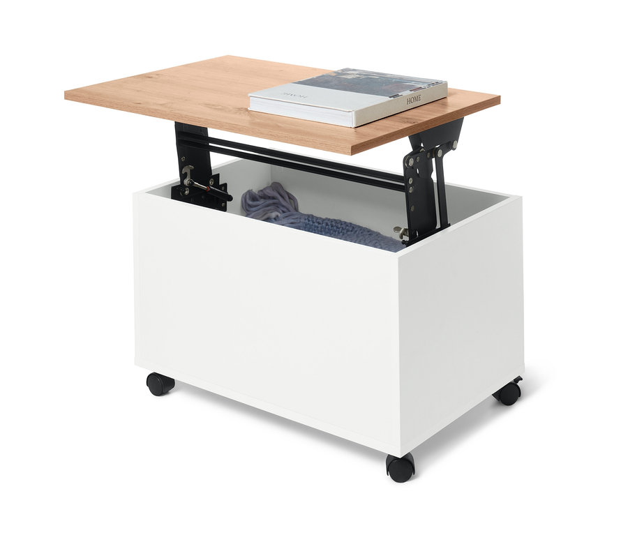 - Tischplatte kann per Liftfunktionscharnier hochgestellt werden, inkl. 4 Rollen, 2 davon arretierbar