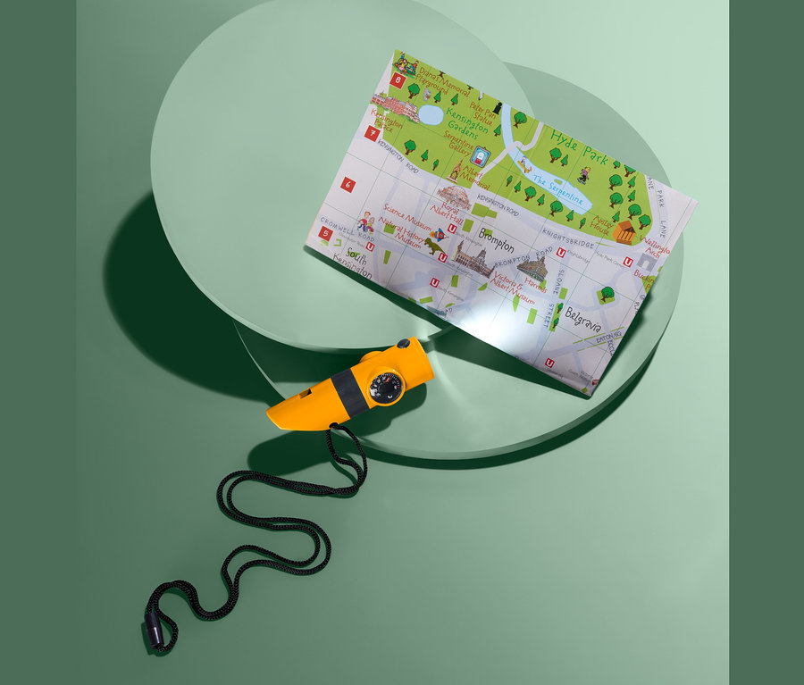 - LED-Taschenlampe, Kompass, Thermometer, Pfeife, Lupe, Spiegel und Mini-Geheimfach