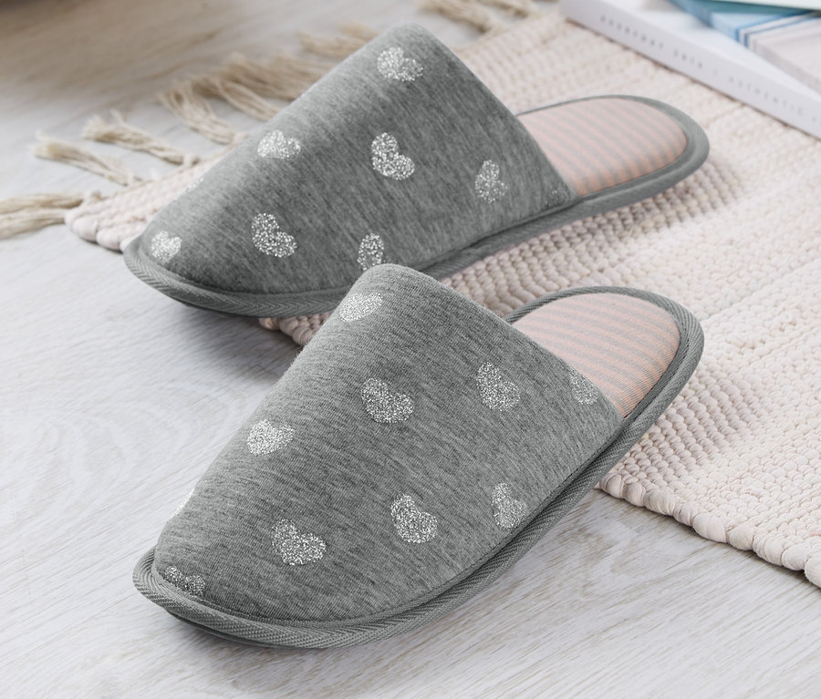 Zu Hause relaxen und sich wohlfühlen ist mit der richtigen Kleidung gleich noch netter und gemütlicher – und dazu gehören natürlich die passenden Schuhe. Wie diese Hausschuhe, die man dank ihrer weichen Baumwoll-Mischqualität und der weich gepolsterten Decksohle auch wunderbar barfuß tragen kann. Das Glitzerherz setzt dabei einen hübschen optischen Akzent.