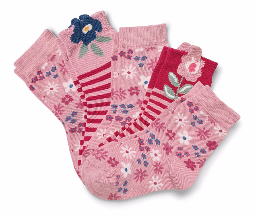 - 3x altrosa mit floralem Einstrick, 1x beere mit altrosafarbenen Streifen und mehrfarbiger 3D-Blume, 1x altrosa mit beerefarbenen Streifen und mehrfarbiger 3D-Blume
