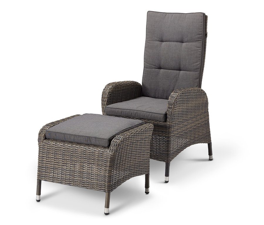 Die beiden Gartenmöbel sind mit ihren beiliegenden Polstern besonders komfortabel. Auf dem Sessel bieten ein Sitz- und ein Rückenkissen perfekten Komfort, der Hocker hat ein bequemes Sitzkissen. Zudem ist die Rückenlehne mit Gasdruckfeder ausgestattet, dadurch stufenlos verstellbar und immer auf die Wohlfühlposition einstellbar.