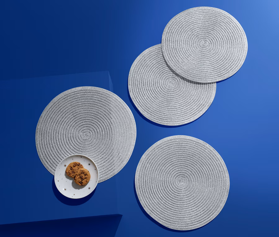Was für ein schöner Anblick: Diese vier Platzsets harmonieren dank ihrer runden Form ganz wunderbar mit Tellern. Ihre graue Farbe und der silberne Glanz sind zudem ein edles Detail, das die Sets besonders geeignet für festliche Tafeln macht.