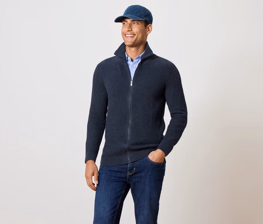 - Formstabile Rippbündchen an Ärmeln, Ausschnitt und Saum