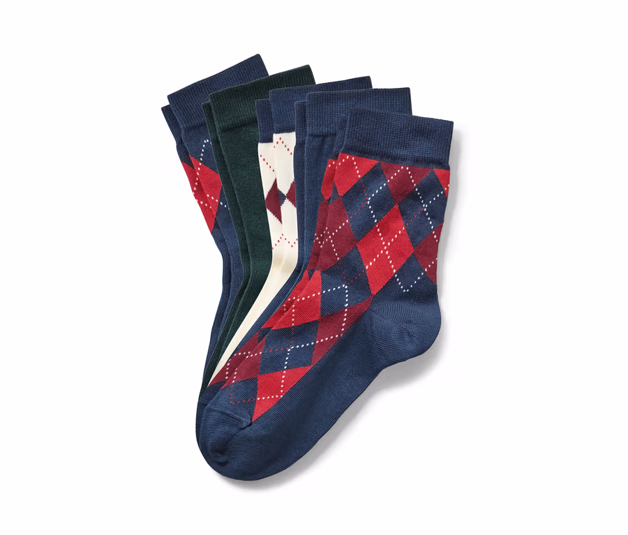- 1x dunkelblau mit rotem Rauten-Einstrick, 1x dunkelblau, 1x cremeweiß mit mehrfarbigem Rauten-Einstrick, 1x dunkelgrün, 1x dunkelblau mit rotem Rauten-Einstrick