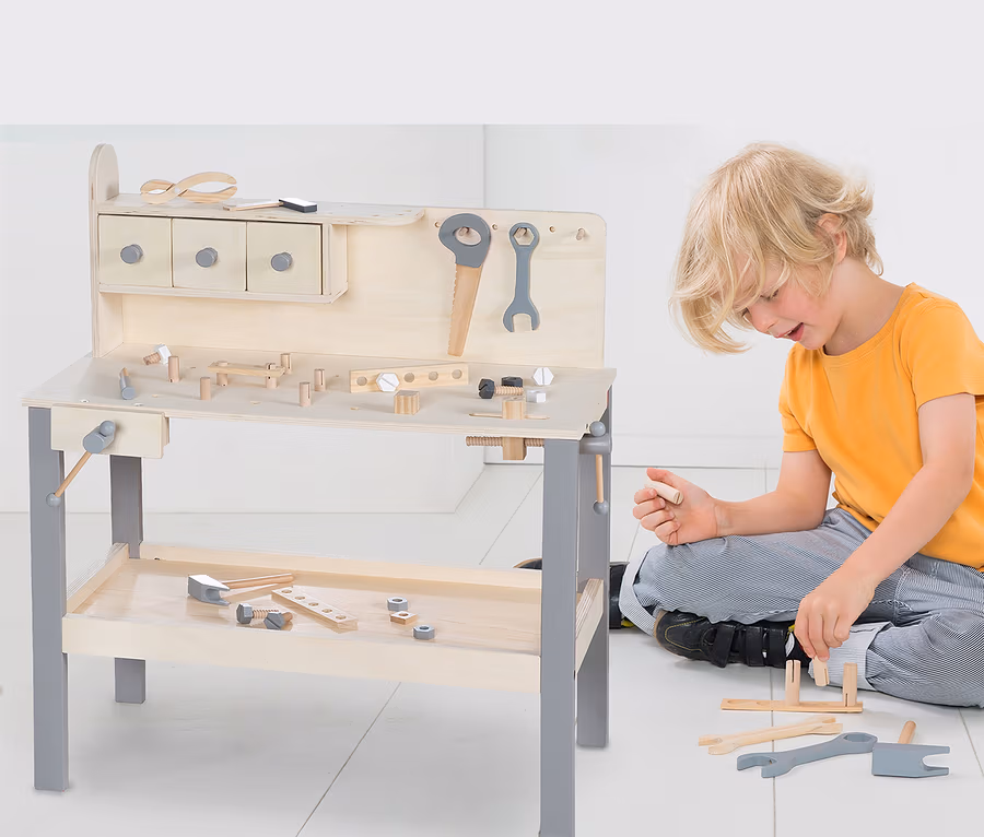 - Inkl. Werkzeugset aus Hammer, Säge, Schraubenziehern, Schrauben und Muttern