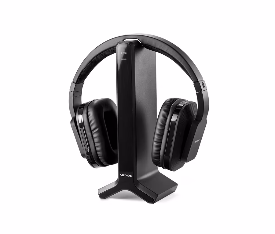 Der Bügelkopfhörer bietet dank der eng umschließenden, weich gepolsterten Ohrmuscheln und einem verstellbaren Kopfbügel sicheren Sitz sowie höchsten Tragekomfort. Er kann mit oder ohne Kabel genutzt werden und lässt sich einfach mit dem Fernseher oder der Stereoanlage verbinden. Die Sendeeinheit sorgt für eine Reichweite von bis zu 20 m und dient gleichzeitig als Ladestation für den im Funkkopfhörer verbauten Akku.