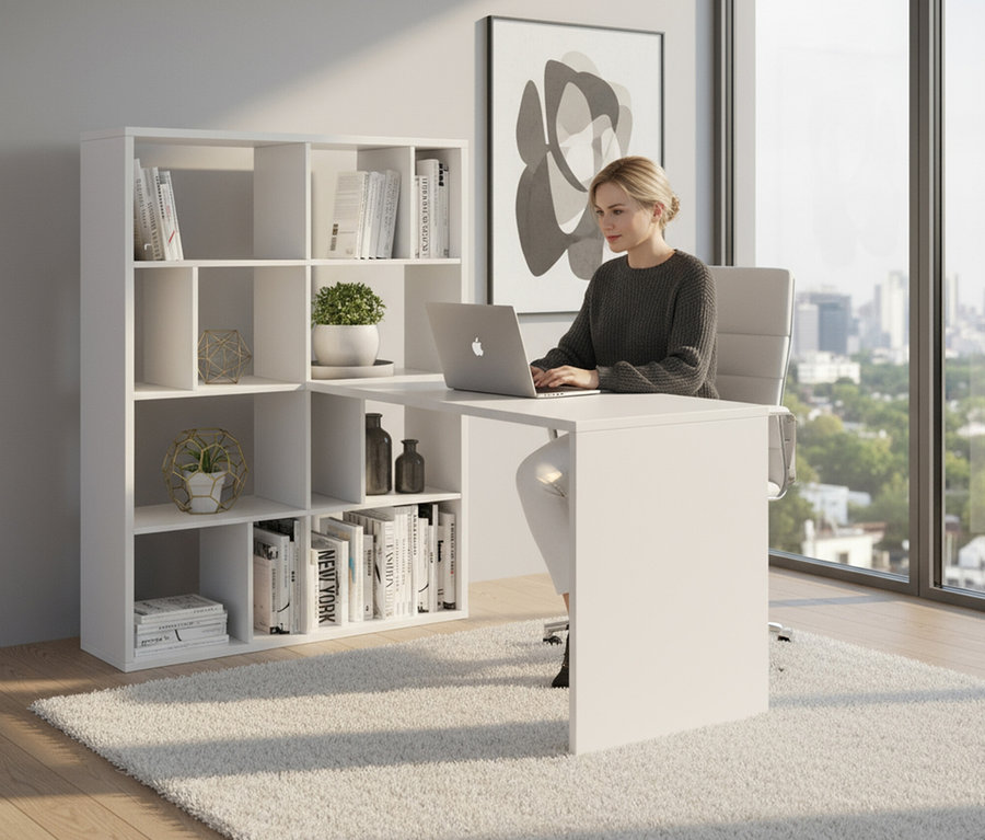 • Regal mit asymmetrischer Struktur und Schreibtischanbau