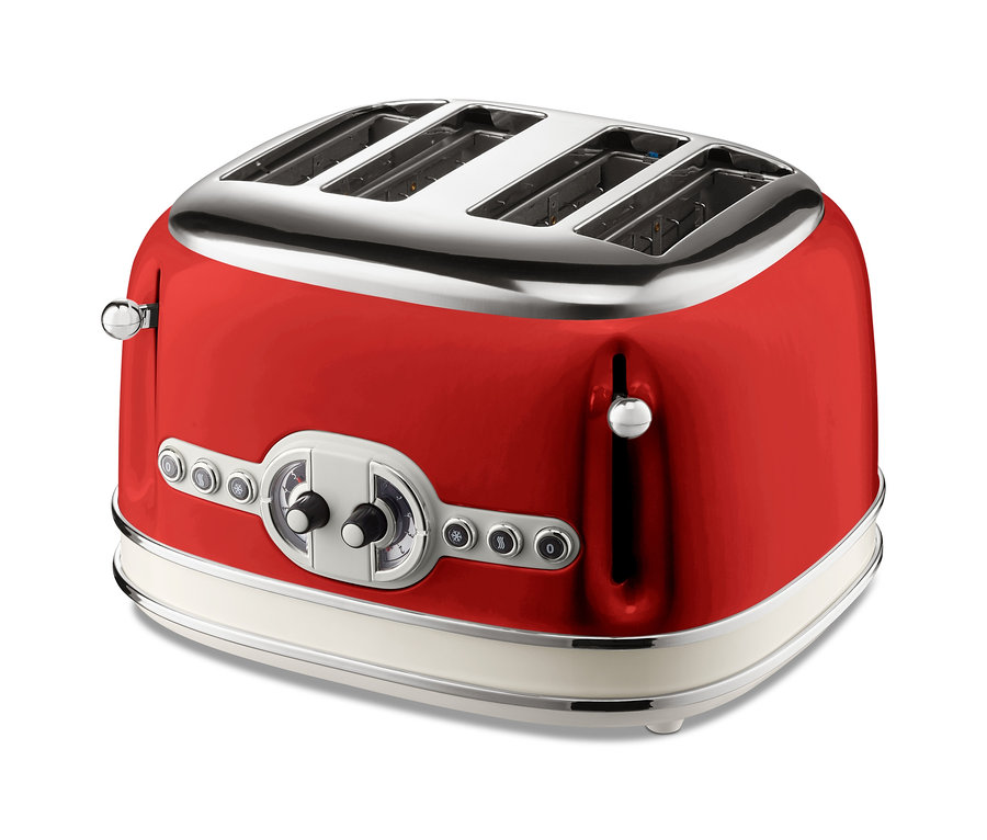 Zeitgemäße Küchentechnik im coolen Retro-Style mit lackiertem Edelstahlgehäuse und verchromten Akzenten: Der Vintage-Toaster für vier Scheiben Brot sorgt mit maximal 1.600 Watt für schnelle Toastergebnisse. Einstellen lassen sich sechs Bräunungsgrade – natürlich für jeden Schlitz einzeln. Und wenn man sich vertan hat, verfügt jeder Schlitz auch über eine separate Auswurftaste. Der Toaster kann natürlich aufwärmen und auftauen, hat eine Röstfunktion und dank ausziehbarer Krümelschublade ist er nach dem Toasten im Handumdrehen gereinigt.