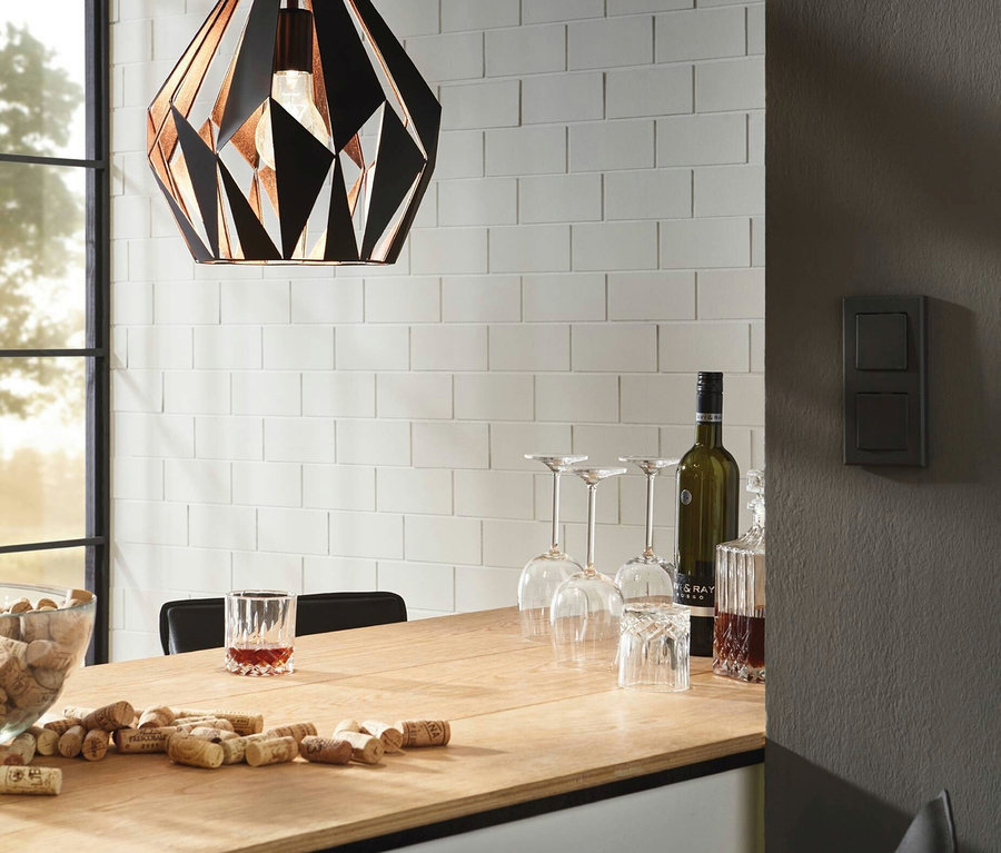 - 2-farbiger Lampenschirm: außen schwarz, innen Kupfer – für eine warme Lichtstimmung
