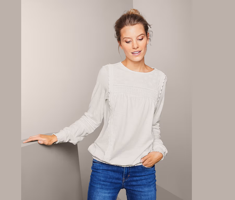 Dieses Blusenshirt mit Rundhalsausschnitt kann mit seiner optischen Leichtigkeit ebenso punkten wie mit seiner weich fließenden Baumwoll-Modal-Mischqualität, mit der es angenehm leicht am Oberkörper liegt. Das Damenshirt hat auf der Vorderseite und im Ellenbogenbereich eine dezente Stickerei aus reiner Baumwolle, die für einen verspielt-romantischen Look sorgt. Der breite, elastische Bund am Saum und an den Ärmelabschlüssen sorgt für einen bequemen Sitz.