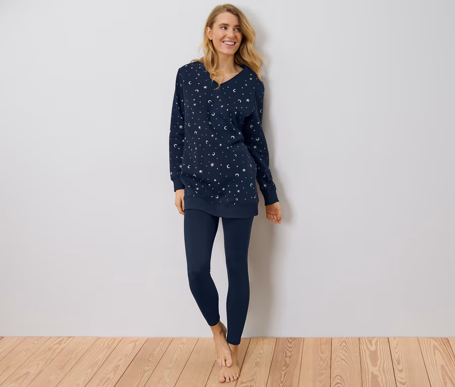 Das Beste daran ist die Leggings. Der Pyjama kann ohne weiters auch als Hausanzug getragen werden.