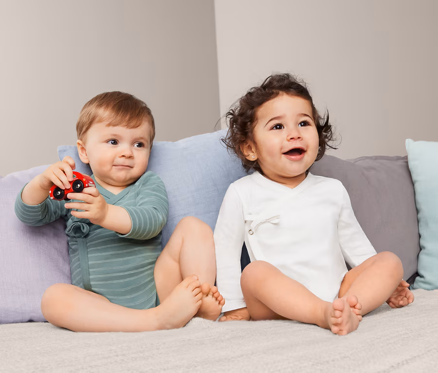 Bodys gehören zu den unverzichtbaren Basics bei jeder Baby-Unterwäsche-Erstausstattung, sind aber auch im Kleinkindalter noch extrem praktisch. Und diese beiden Langarmbodys sind zusätzlich noch wunderbar bequem. Sie sind in formbeständiger Feinrippqualität aus reiner Bio-Baumwolle gefertigt, die für einen noch höheren Tragekomfort weich aufgeraut wurde. An der Seite und im Schritt haben die Bodys Druckknöpfe, mit denen man sie komplett öffnen kann – was gerade beim Wickeln hilfreich ist. Vorne haben sie eine kleine, dekorative Zierschleife und waschen lassen sie sich bei 60 °C in der Maschine.