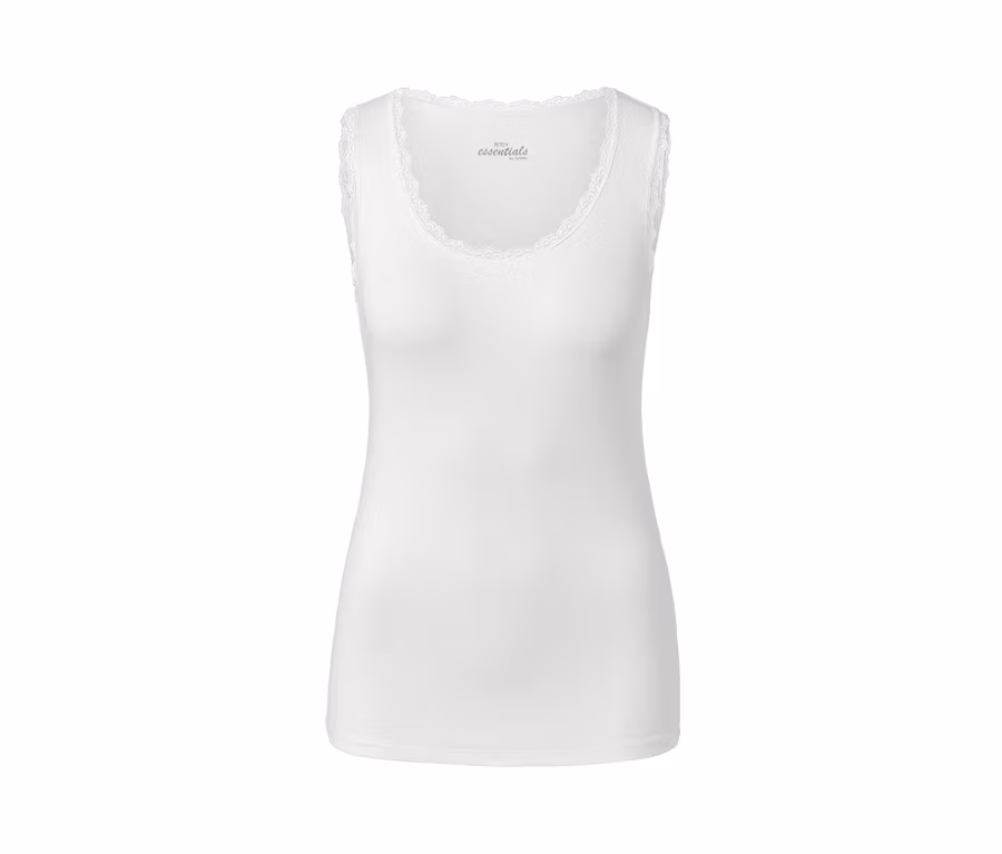 - Halsausschnitt und Armlöcher mit dekorativer Spitze