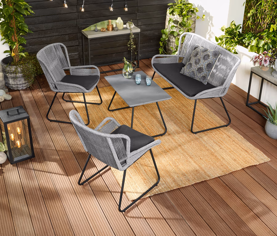 Das Sofa und die beiden Sessel sind mit offenem Textilgeflecht gearbeitet, das ebenso UV- und witterungsbeständig wie schnelltrocknend und elastisch ist – und das dem Set seinen modernen, leichten Look verleiht. Der Tisch hat eine massive Tischplatte in Betonoptik und die Beine sind für eine besonders gute Wetterbeständigkeit doppelt beschichtet.