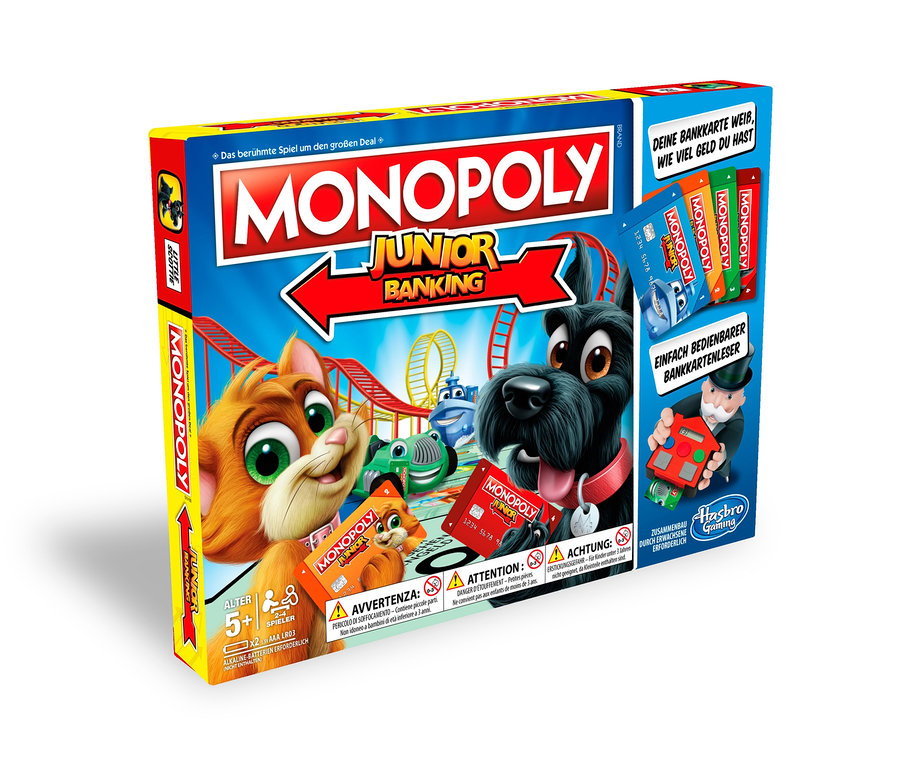 Mit »Monopoly Junior-Banking« kommt einer der beliebtesten Klassiker unter den Brettspielen in kindgerechter und zeitgemäßer Form auf den Tisch. Die Variante ist auf die Bedürfnisse der jungen Spielerinnen und Spieler ausgerichtet, so muss man zum Beispiel nur noch zwei Straßen einer Farbe haben, um darauf Häuser und Hotels bauen zu können – das Spielprinzip bleibt aber bestehen: Es geht darum, den anderen per Mieteinnahme das Geld abzunehmen, und selber möglichst wenig davon zu verlieren.