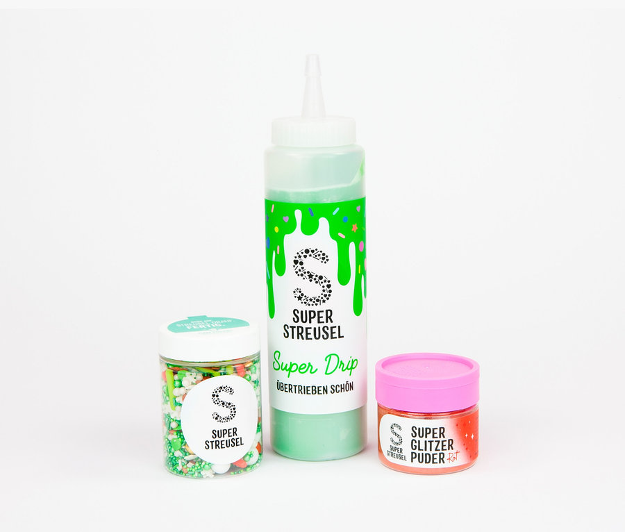 - Inkl. Zuckerstreuselmix mit Schokoladenkugeln 90g (HoHoHo). Farbige Fettglasur für Kuchen 300g (Super Drip grün). Glitzerpuder 10g (Super Glitzerpuder rot)