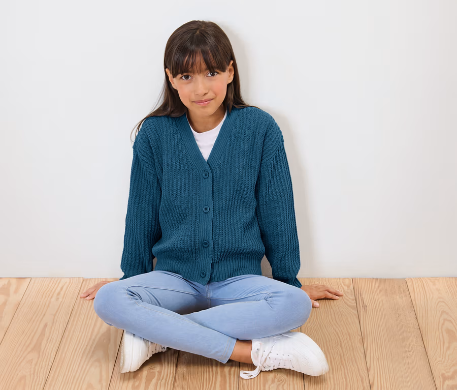 - Rippbündchen an Ausschnitt, Knopfleiste, Ärmeln und Saum