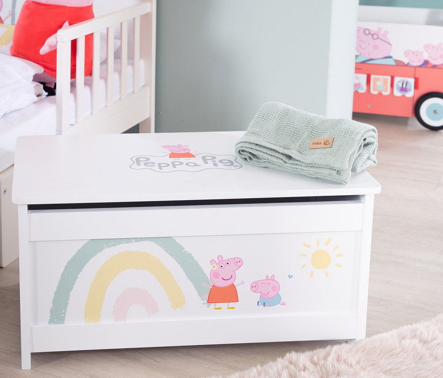 - Truhenbank im Peppa Pig Design zum Aufbewahren von Spielwaren, Büchern und Utensilien – kindgerecte Sitzhöhe von ca. 30 cm