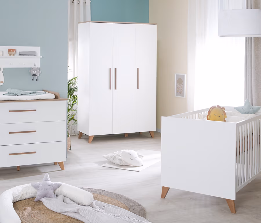 - Set bestehend aus Gitterbett 70 x 140 cm, Wickelkommode sowie 3-türigem Kleiderschrank