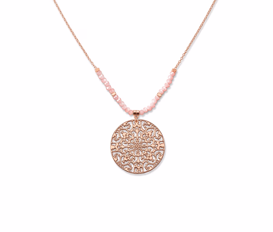 Diese Ornamentkette verleiht jedem Outfit ein schillerndes Highlight. Sie ist rosévergoldet, mit roséfarbenen Glasperlen verziert und in der Länge verstellbar – von etwa 70 auf etwa 80 cm.