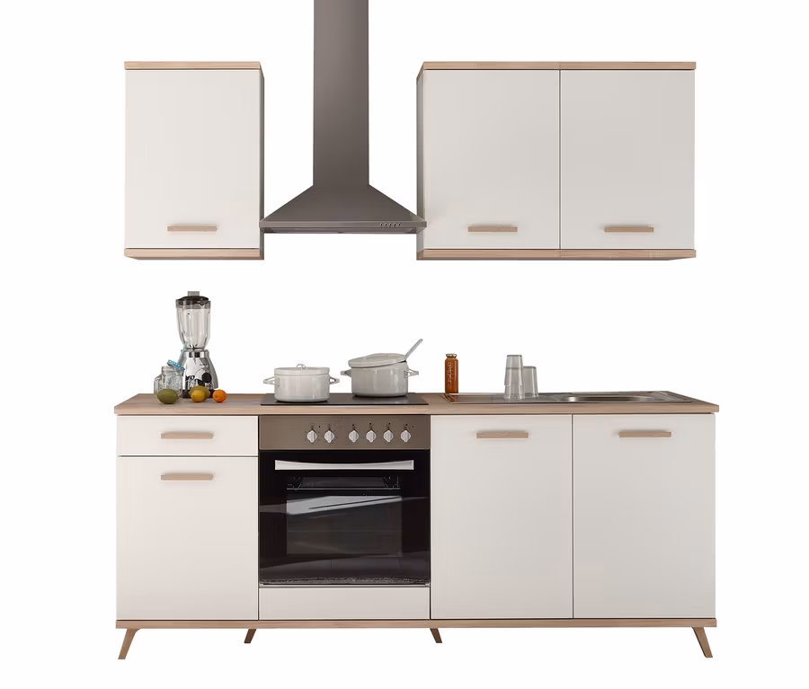 - Bestehend aus: Einbauherd-Set, Kaminhaube, Edelstahl-Einbauspüle, 2 Oberschränken, Unterschrank, Herdumbauschrank, Spülenunterschrank und Arbeitsplatte