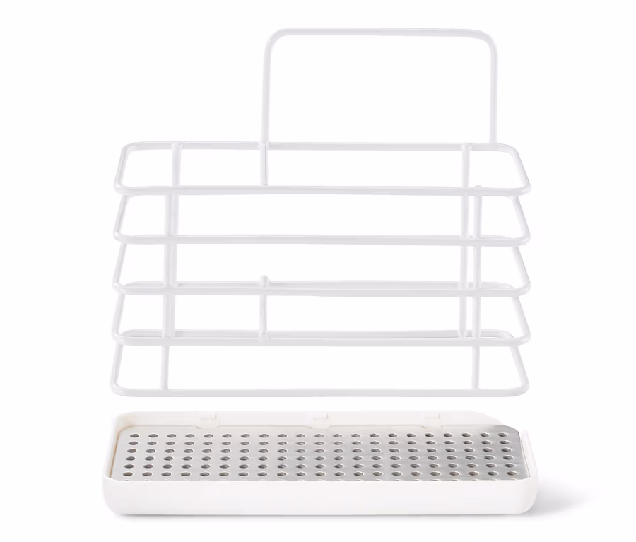 Ein bisschen Ordnung kann nie schaden – besonders in der Küche. Und mit diesem Ständer hat man zumindest schon mal seine Spülutensilien im Griff: Er ist aus pulverbeschichtetem Metall und Edelstahl gefertigt und bietet Platz für Spülbürste, Schwamm & Co. Der Lochboden lässt überschüssiges Wasser in die leicht zu reinigende Auffangschale mit Ausgießnase ablaufen.