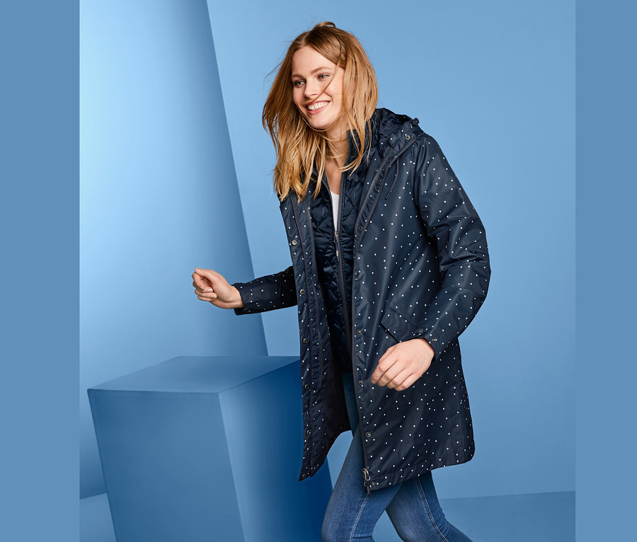 Mit dieser modischen Kombination ist man bei Wind und Regen gut geschützt unterwegs. Sie besteht aus einem Regenmantel und einer leichten, wärmenden Steppweste, die sich einzeln oder für eine wärmende Wirkung mit Reißverschluss verbunden tragen lassen.