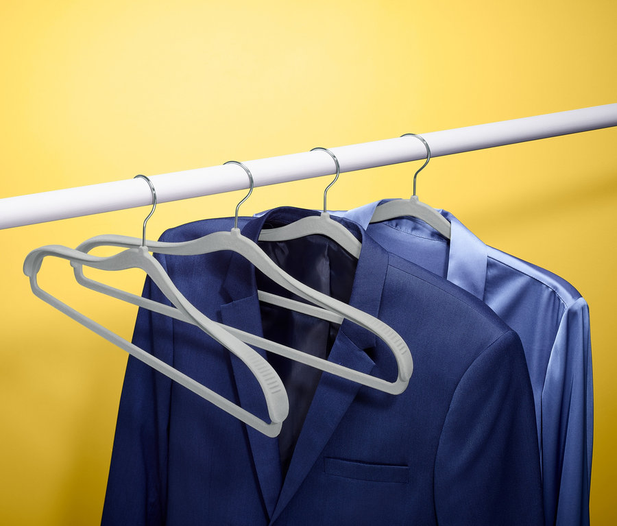 Kleider verstauen wie die Profis – mit diesen Kleiderbügeln mit ausgeprägter Schulterpartie werden Ausbeulen und Faltenbildung der Kleidung verhindert. Durch die stoffschonende, rutschhemmende Beflockung bleiben die Kleidungsstücke sicher und formstabil hängen. Die Bügel verfügen über Querstreben für Hosen und Röcke sowie über einen Haken mit Drehgelenk aus verchromtem Metall.