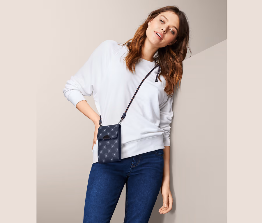 Die zweifarbige Kordel lässt sich individuell in der Länge anpassen – man kann sie aber auch abnehmen und die die vielseitige Tasche dann als Geldbörse nutzen. Das Hauptfach wird durch einen Umschlag mit Metall-Druckknopf geschlossen, innen sorgen diverse Steckfächer für Ordnung. An der Rückseite gibt es ein zusätzliches Reißverschlussfach.