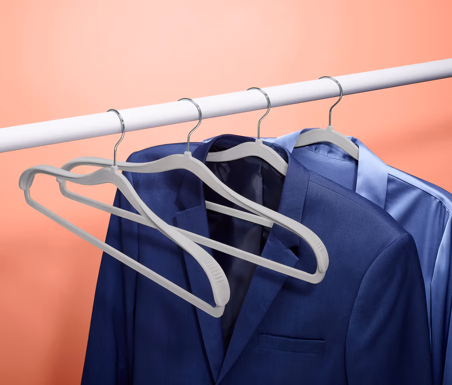 Die Bügel haben eine Querstrebe für eine Hose oder einen Rock und die rutschhemmende Beflockung schützt den Stoff, während sie für einen sicheren Sitz sorgt. Die Haken haben ein Drehgelenk aus verchromtem Metall und die Bügel selbst sind der Nachhaltigkeit zuliebe mit recyceltem Kunststoff gearbeitet.