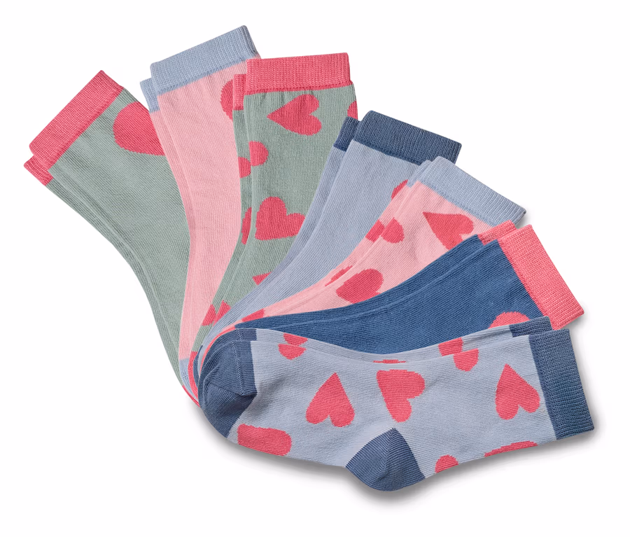 1x hellrosa mit pinkem Herzen-Einstrick, 1x mittelblau mit pinkem Herz-Einstrick, 1x hellblau mit pinkem Herz-Einstrick, 1x hellblau mit pinkem Herz-Einstrick, 1x graugrün mit pinkem Herz-Einstrick, 1x hellrosa mit pinkem Herz-Einstrick, 1x graugrün mit pinkem Herz-Einstrick