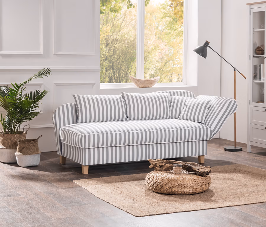Liebevolle Verarbeitungsdetails, wie die sanft geschwungene Rückenpartie und die umlaufende Kedernaht am Sitz, machen die Recamiere zu einem zeitlosen Klassiker für Wohn- oder Gästezimmer. Für höchsten Sitz- und Liegekomfort sorgt der eingeschäumte Federkern im Sitz. Wählen Sie zwischen drei verschiedenen Stoffvarianten: der pflegeleichte anthrazitfarbige Bezugsstoff in angesagter Leinenoptik für ein nordisch, modernes Flair, den romantisch, verspielten floralen Bezugsstoff für ein heimeliges Landhausambiente oder das grau-weiß gestreifte Flachgewebe für einen maritimen Look.
