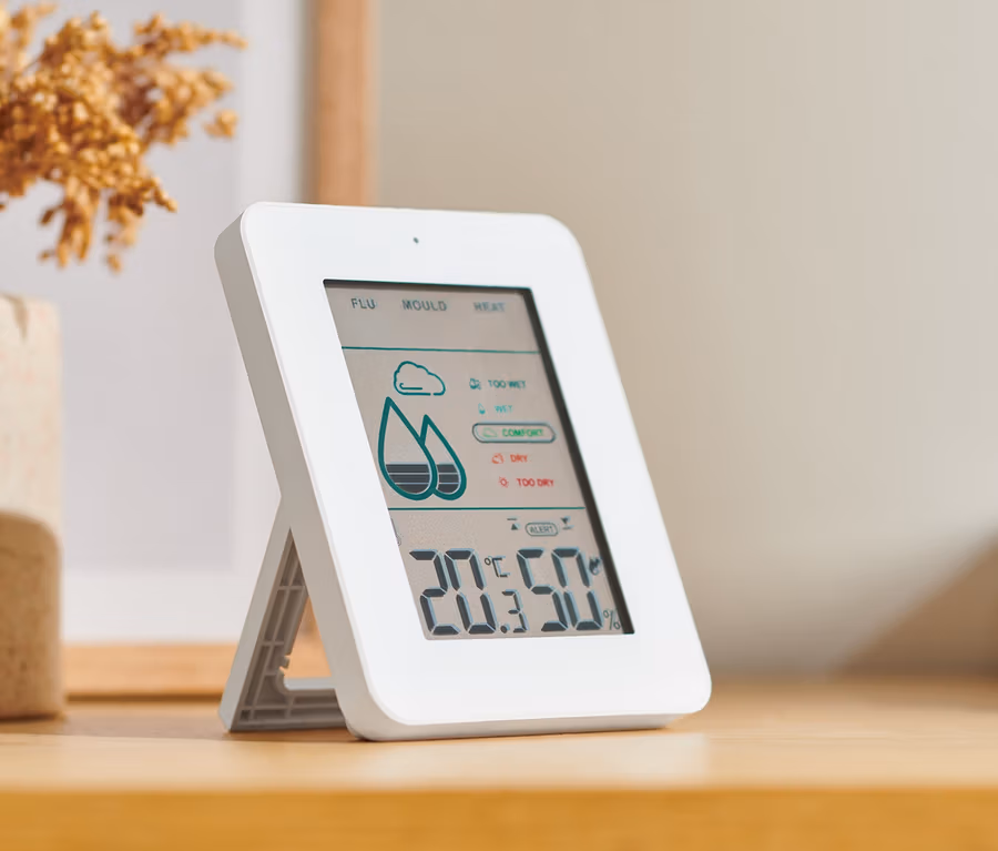 - Alarm bei zu hoher oder zu niedriger Luftfeuchtigkeit, mit programmierbaren Ober- und Untergrenzen